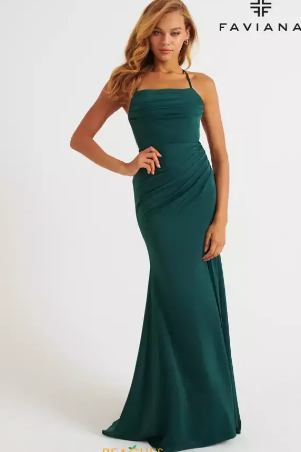 Simple and classy gown by Faviana 11064 is the perfect choice for your next special occasion. A classy scoop neckline is paired with thin straps that create an adjustable lace up back for a supportive and flattering fit. A light amount of ruching adorns the gown perfect to accentuate your figure. A classy slit and sweep are added for a small touch of drama.