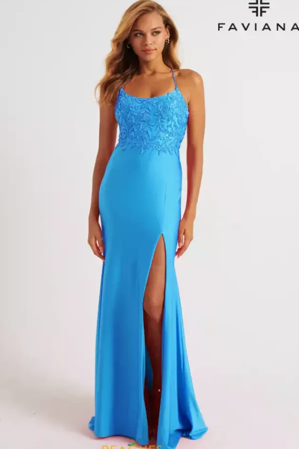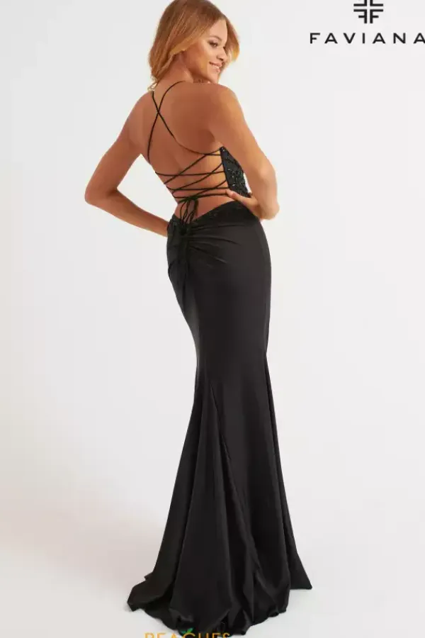 Gorgeous Faviana long dress 11264 is the perfect choice for any special event. The timeless fitted dress showcases a modest scoop neckline paired with thin shoulder straps that flow into a lace up open back ensuring a perfect fit. The charmeuse material features a touch of dazzling beadwork adding the perfect amount of sparkle.