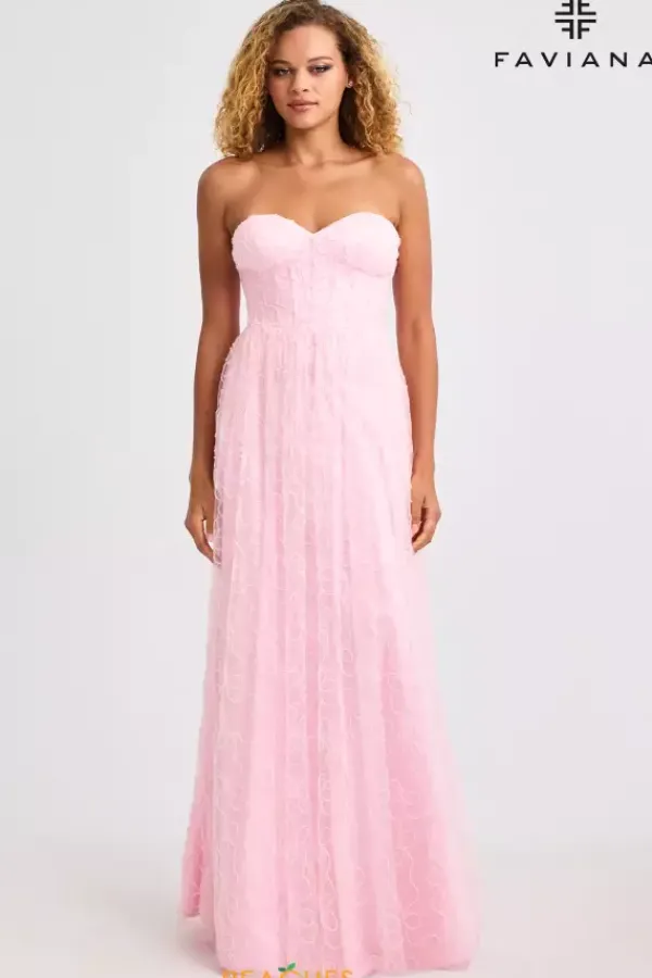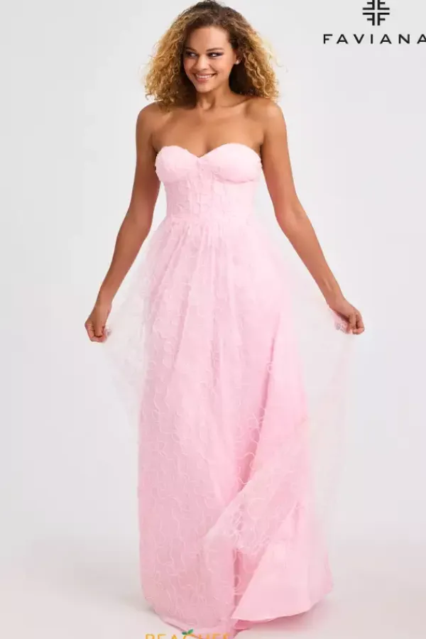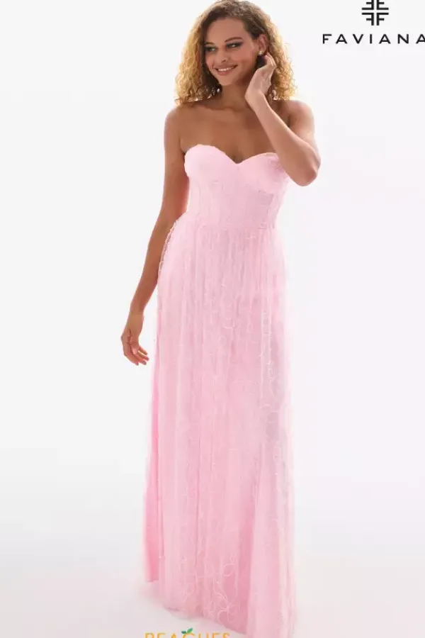 Feel like a modern day princes when you wear this long A line dress by Faviana style 11418. This fabulous dress features a strapless sweetheart neckline and a corset lace up back that will hug your curves beautifully. The entire dress is adorned with amazing beadwork and made with one of a kind novelty material.