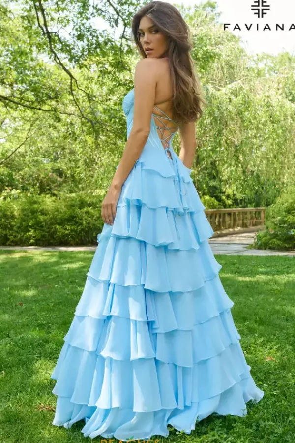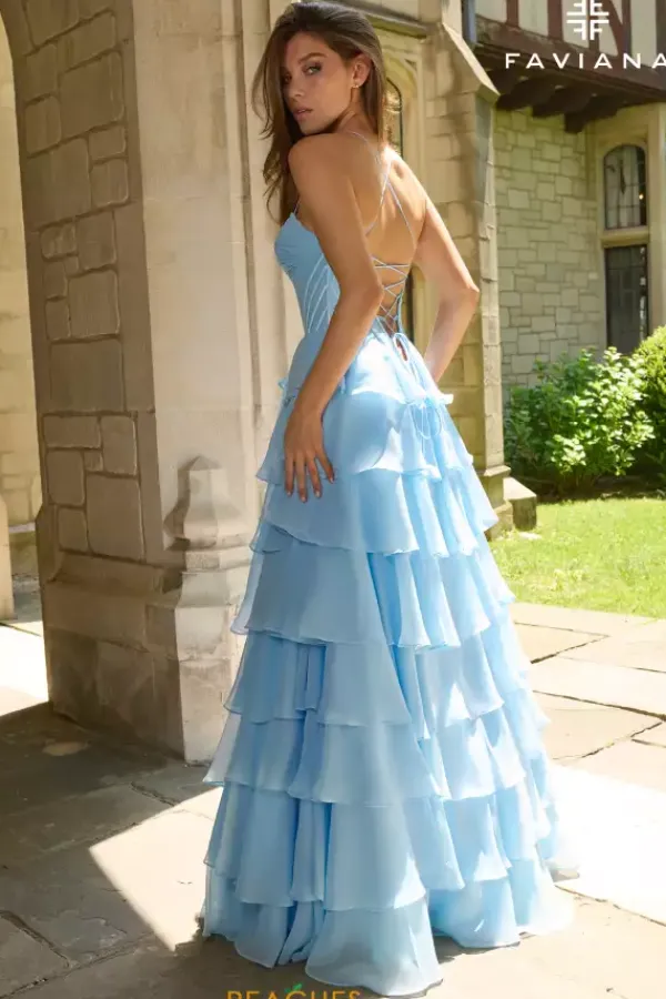Feel like a modern day princes when you wear this long a line dress by Faviana style 11420. This beautiful dress features a sweetheart neckline that cascades into a open corset lace up back that will your curves. The skirt of the dress has a unique ruffle design and made from chiffon material that will turn heads the whole night.