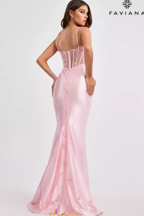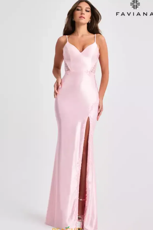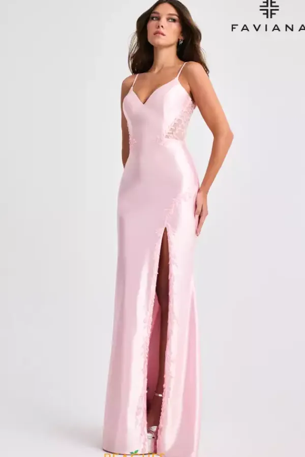 Feel runway ready in this stunning long fitted dress designed by Faviana style, 11466. This satin dress has an enticing V neckline and a breathtaking bodice that is detailed with amazing applique and beadwork on the sides of the waist, and back of the dress. Featuring a thigh high slit that reveals a long swoop train.