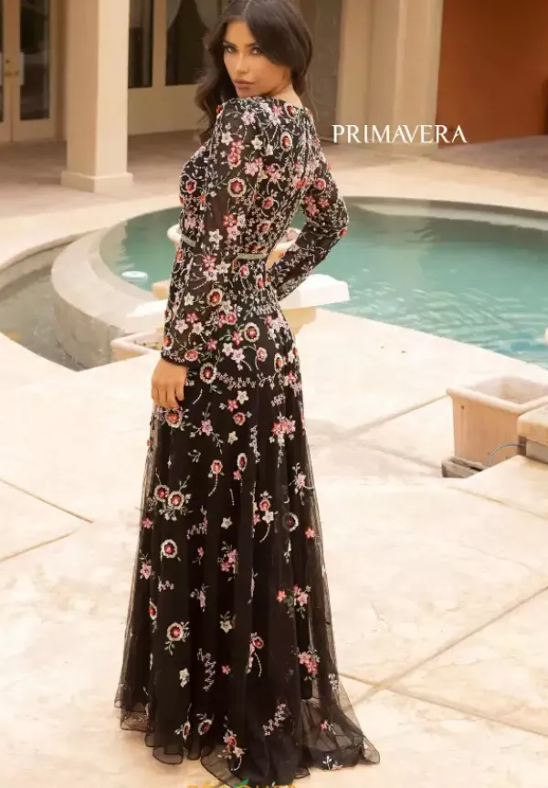 Dance the night away wearing this enchanting long dress 12006 by Primavera. The classic a line silhouette is adorned with sparkling floral beadwork that will be sure to light up the room. The v cut neckline wraps into long fitted sleeves and a high back. A shining beaded belt is added to define the waist.