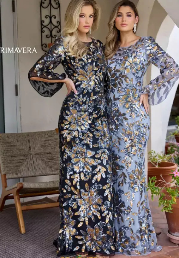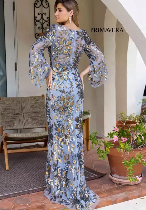 Grab the attention of all wearing the fascinating long style 12171 by Primavera. The high neckline is combined with delicately beaded long sleeves with a bell like ending. Showcasing the unique sequin displayed all over the entire fitted silhouette to have you glistening perfectly all night from every angle.