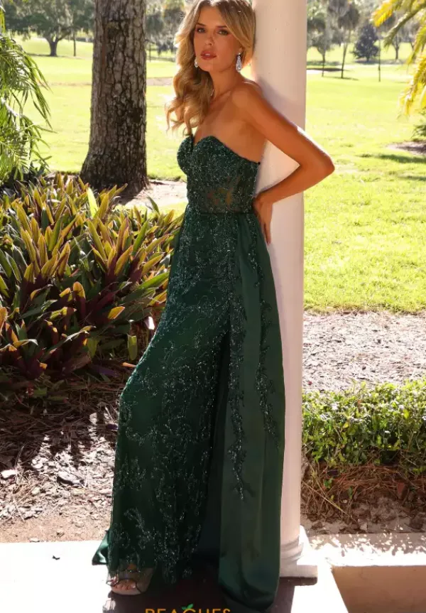 Be the embodiment of glitter in this ultra shiny Primavera bedazzled prom dress style 12213. From the strapless sweetheart neckline down to the straight sweep train, glimmering combinations of beads and sequins encrust the body con silhouette in a stunning pattern that matches tot top of the extra long satin overskirt.