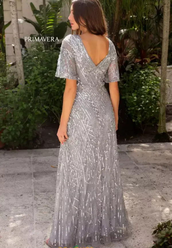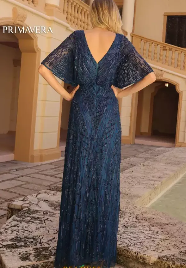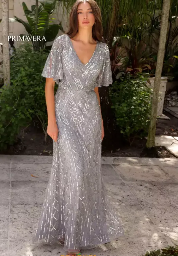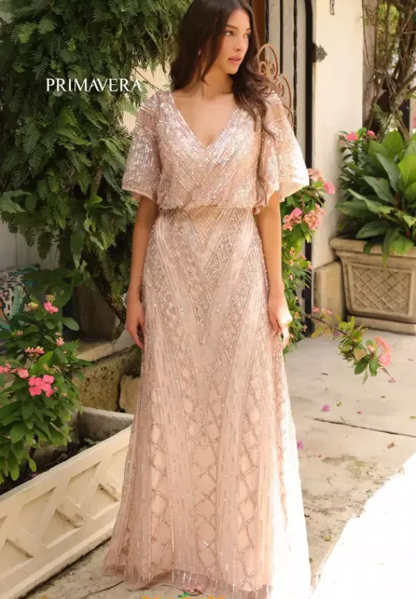 Feel like a modern day princess in this enchanting long a- line dress by Primavera, style 13119. Featuring an a-line silhouette with a modest v neckline that has gorgeous flowy cap sleeves. This ensemble is fully adorned with glistening sequins and beautiful intricate beadwork that sure to have you sparkling all night long.