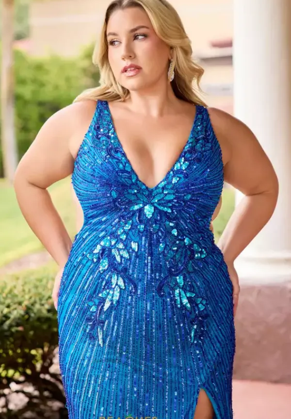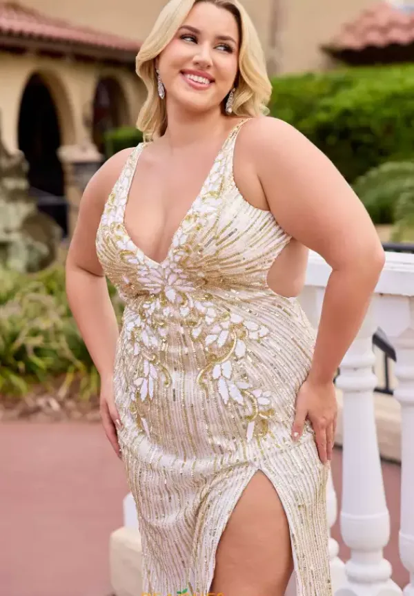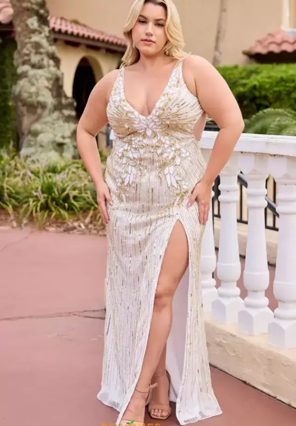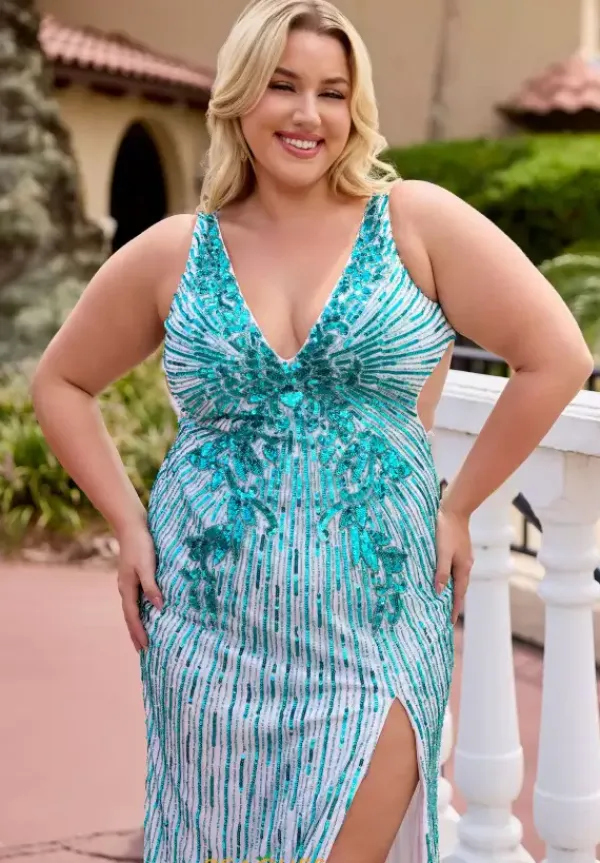 Be bold and fashionable in this vivacious Primavera hand beaded prom dress style 14104. The seductive low open back features a flattering crisscross adjustable closure attached to the thick supportive straps of the deep v neckline fitted bodice while the long skirt flaunts a fierce thigh high slit. Clusters of vibrant sequins adorn the center of the bodice and flare into dainty rows throughout the entire dress.