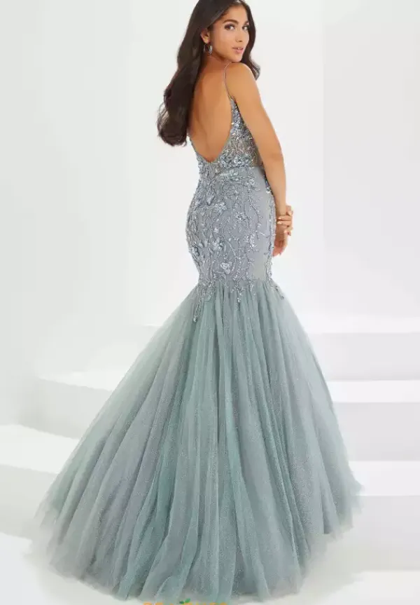 Make heads turn when they see you walk in wearing this one of a kind Tiffany long dress 16025. This stunning mermaid silhouette showcases a v cut neckline and mesmerizing open back. Adorned with dazzling beadwork hand sewn to perfection adding the perfect glam and sparkle. The glitter tulle skirt features a sweep train.
