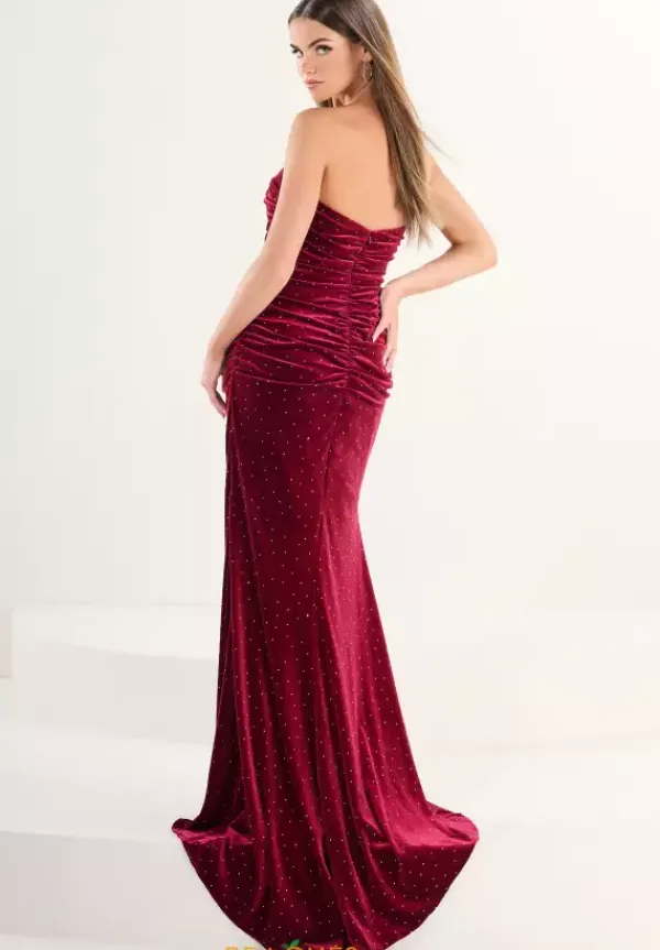 Make everyone’s heads turn when they see you wearing this regal long fitted dress by Tiffany style 16285. This bodice has a pleasant strapless v neckline with mesh in the middle for coverage. The entire bodice is made in comfortable velvet material with dazzling beadwork. The back of dress has a back zipper for support along with ruching in the back.