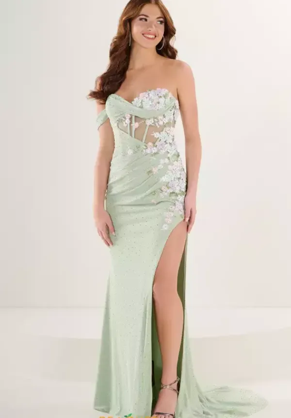 Sexy, yet sophisticated this beautiful fitted long Tiffany dress 16306. This gorgeous gown features a sweetheart neckline thats highlights an asymmetrical off the shoulder cap sleeve. The sheer corset bodice highlights your figure, while shimmering appliques add a lavish touch. The fitted skirt showcases delicate ruche detailing and an extravagant high slit.