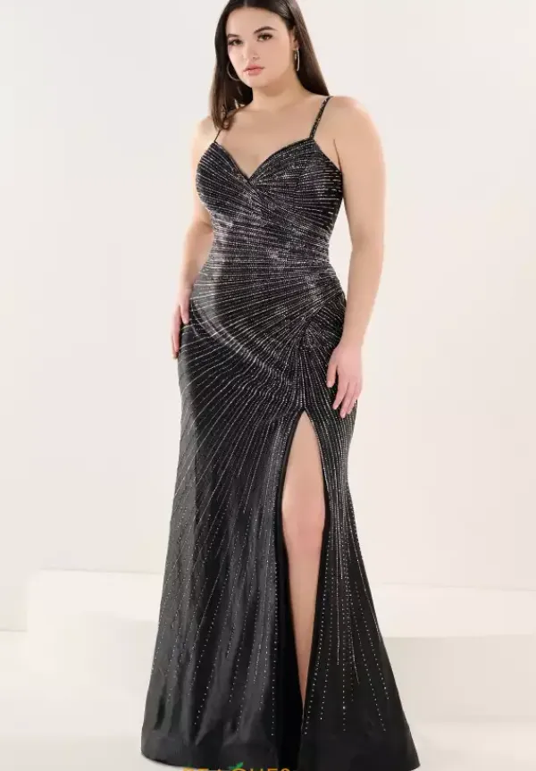 Exude confidence in this stunning Tiffany plus size dress 16307. Sexy, yet sophisticated this gorgeous style features modest v neckline and dainty beaded straps. Bright stones create an elaborate array of embellishment that is the epitome of perfection. Made in a fitted jersey fabric, the log fitted skirt showcases a dramatic high slit.
