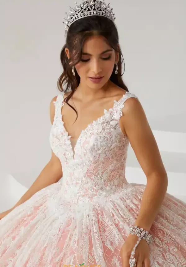We are loving the versatility of this elegant ball gown dress 26005 by Tiffany Quinceanera. This dress showcases a v neck bodice with applique and lace detail and detachable lace long sleeves. The beadwork is very elegant and memorable along with the skirt and the train of this dress. The back of the bodice features a classic corset lace back.