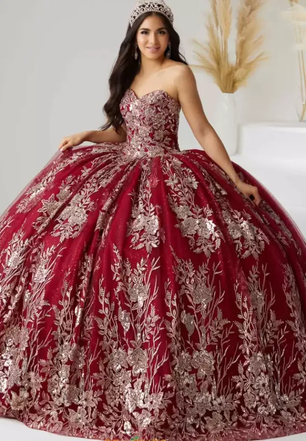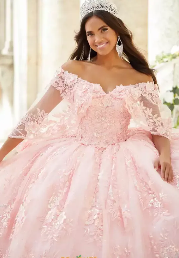 Be the center of attention at your quinceanera in this ravishing Tiffany Quinceanera style 26029. Featuring a strapless neckline, this stunning ball gown is complemented by a detachable short cape. The versatile fitted bodice is adorned by dazzling bead work and lovely lace that delicately decorates the sparkle tulle skirt.