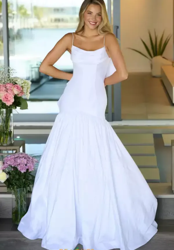 Sophisticated and glamorous is how you will feel when you wear this Ava Presley mermaid dress to your prom. Style 26422 is made from gorgeous taffeta material in bold colors. The scoop neckline has thin shoulder straps. The dress is fitted to right above your knees where the mermaid style skirt flares out.
