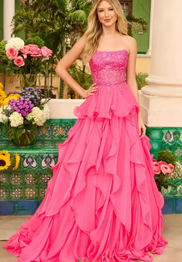 Glisten effortlessly like a princess showing up in lovely long style 29133 by Ava Presley. Showcasing the fitted bodice embellished with delicate applique and detailed with meticulously placed sequin. Headlining the complimentary scoop neckline and a daring chiffon flowing skirt mimicking the waterfall look to have you leaving an everlasting impression.