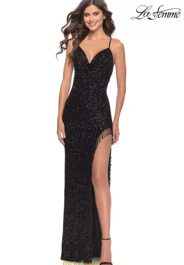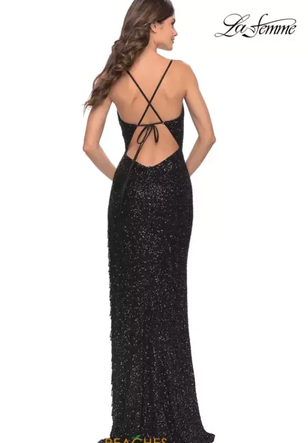Look positively classy and refined in La Femme fitted style 31389, displaying a V neckline defined with elegant ruching with slim straps that cross and tie for the alluring back style. What further makes this captivating gown stand out is the fringe beading decorating the side slit, adding to the luxurious look.
