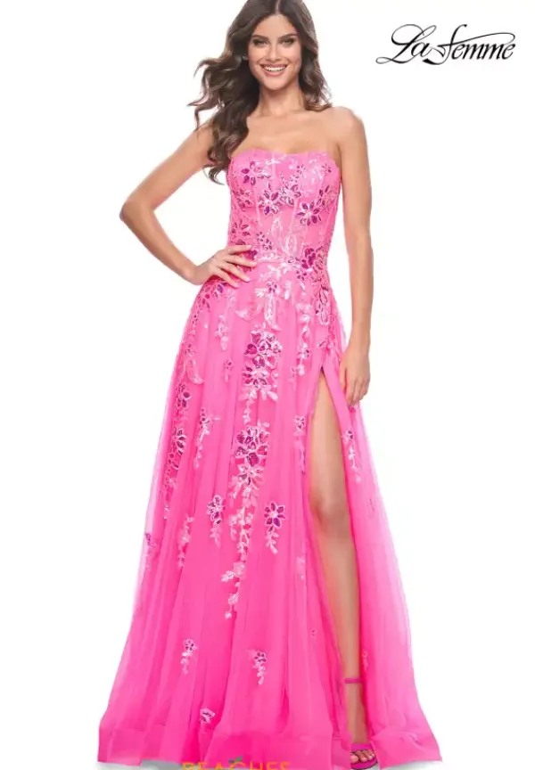 Lovely and charming La Femme style 32137 easily stands out with shimmering floral beaded applique that adorns the bodice and beautifully rains down the voluminous tulle skirt in an elegant pattern. Featuring a fitted, strapless bodice with super chic boning details. The tulle skirt flows effortlessly.