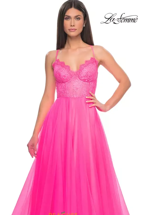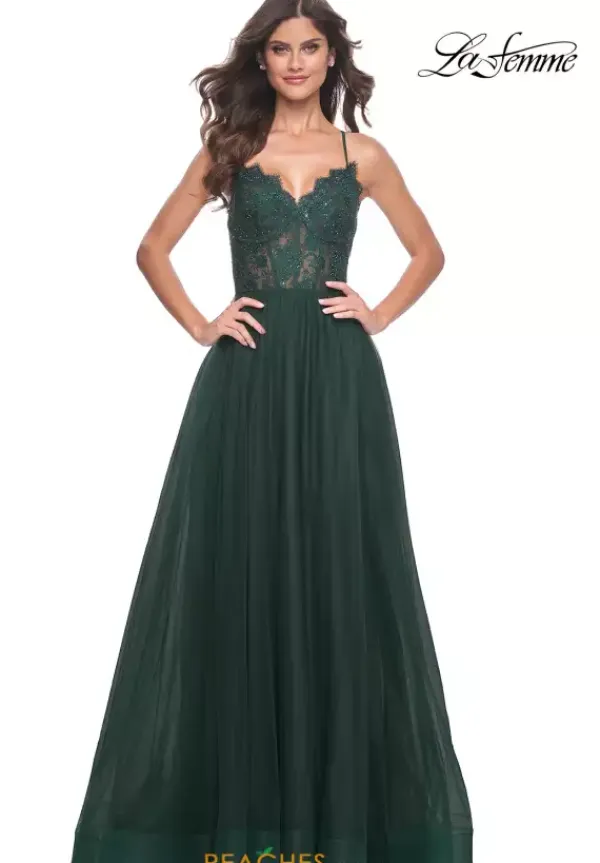 Feel and look like a modern day princess when wearing this long a- line dress by La Femme, style 32306. This ensemble comes in three different colors: fuchsia/hot pink, green and yellow. Featuring a modern v- neckline leading to a sexy open back with an asymmetrical corset lace up back that will for sure hug your body gorgeously. The corset of this dress is see through and it’s adorned of lace material and glistening beadwork throughout the top. The skirt is made out of tulle material to give it a dramatic effect. To amp up the drama it has a sexy high thigh slit.