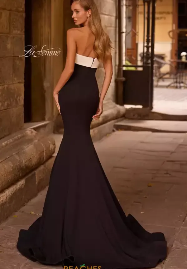 Amp up the drama when wearing this long fitted jersey dress by La Femme, 32914. Featuring a modern strapless neckline that’s adorned with jersey material leading to a back zipper closure. Showcasing a beautiful silhouette that will hug your bodice gorgeously all day long. For the perfect final touch the bottom flares out and it has a beautiful train.