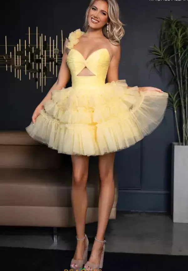Feel like a modern day princess in this enchanting short dress by Rachel Allan, style 40458. Showcasing an A-line silhouette with a asymmetrical single shoulder strap that lead to a corset lace up back. The bodice has a sweetheart neckline with a key hole opening. This number is fully made out of tulle material. The ruffled layered skirt is the perfect final touch.