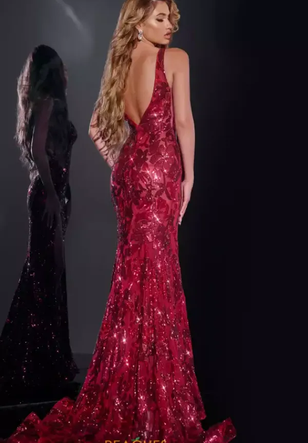 Look red carpet ready in this sizzling hot Jovani long dress style 40755 embellished in floral sequin appliques throughout. This glistening gown features a fitted bodice with a V neckline, thick straps and low V back. The long slim skirt has a high front side slit to show off your legs and a small back sweep train.