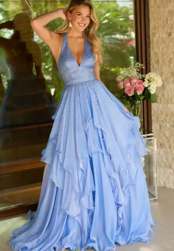 What’s not to love about this enchanting princess styled A-line dress 42238 designed by Ava Presley. Glistening beaded stones garnish the fitted zip up bodice, halter v-neckline, straps, and scatter onto the ravishing A-line chiffon long skirt where a wavy long sweep train creates an elegant finish.