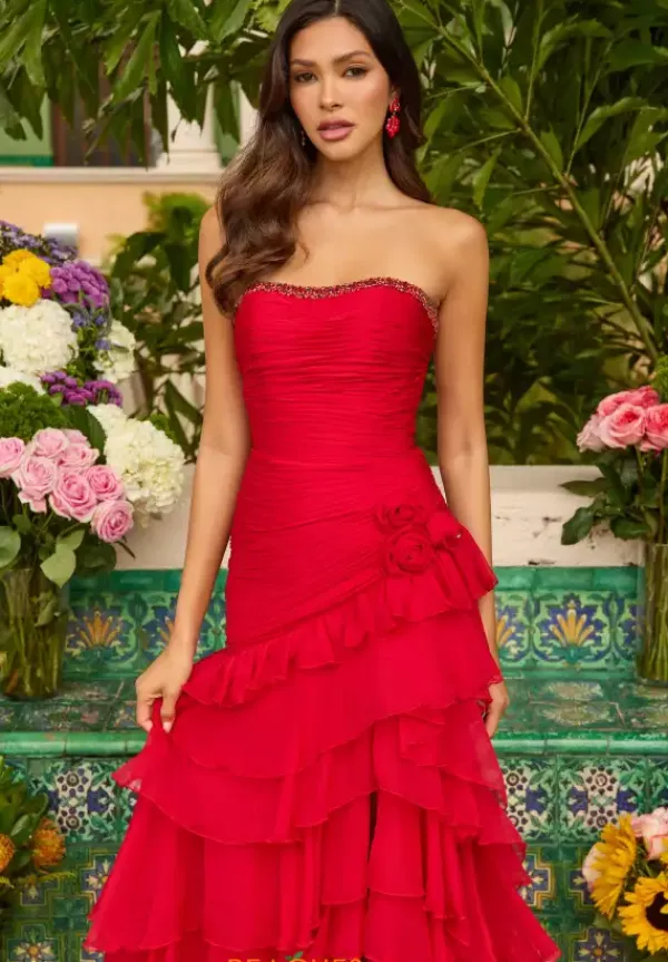 Look romantic and chic in this swirling chiffon Ava Presley long dress style 42242 trimmed with tonal stones along the top. This sensational silhouette showcases a strapless fitted bodice with ruching, drop waist with rosette detailing and zipper back. The long, a line skirt has tiered ruffle layers with a front slit and back sweep train. Blush color has tonal stones.