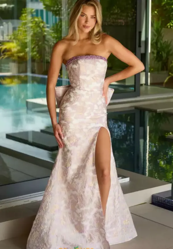 Leave that everlasting impression wearing shocking long style 42282 by Ava Presley. The strapless straight across neckline is daintily embellished with beadwork that lines the time of the neckline. Beautifully cut from a brocade material in a fit and flare silhouette detailed with a thigh high slit and a lovely detachable bow to match.