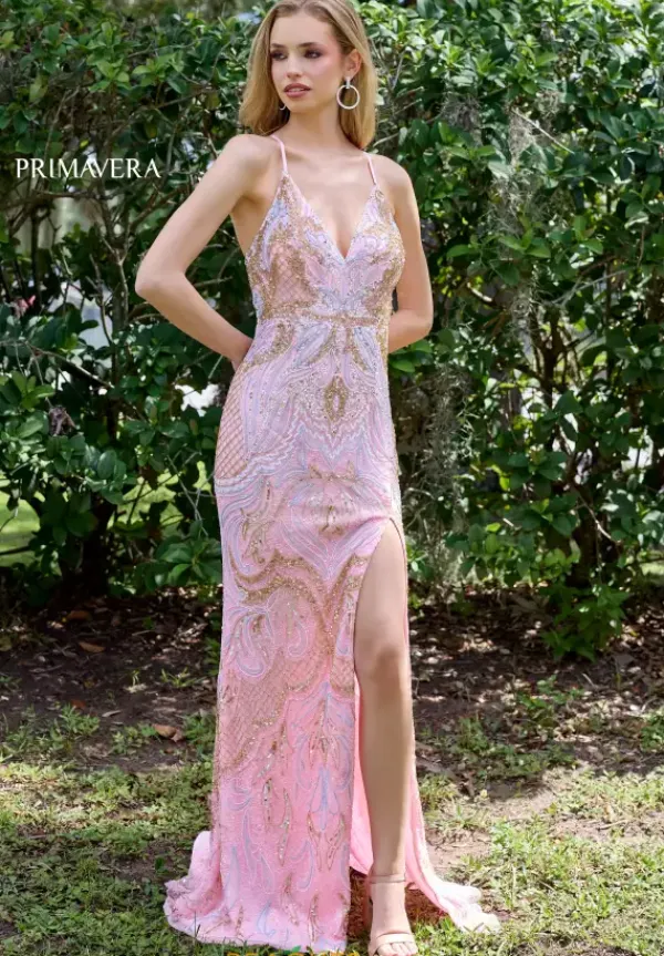 Have a major fashion statement wearing this stunning long fitted dress by Primavera, style 4311. Featuring a V neckline and an open back with criss cross straps for extra support. The long slimming skirt has a stunning slit and sweep train. Adorned in mesmerizing beadwork, this dress will make you picture perfect.