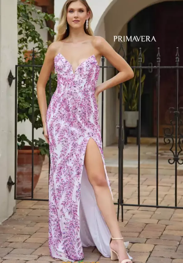 This breathtaking strapless dress by Primavera 4314 is a true statement of glamor and elegance. Fully adorned with intricate beadwork, the dress glistens with every movement, creating a stunning, sparkling effect. The form-fitting silhouette shapes the body, while the thigh-high slit adds a bold touch. A sweeping train flows elegantly from the back, adding an extra layer of drama and sophistication.