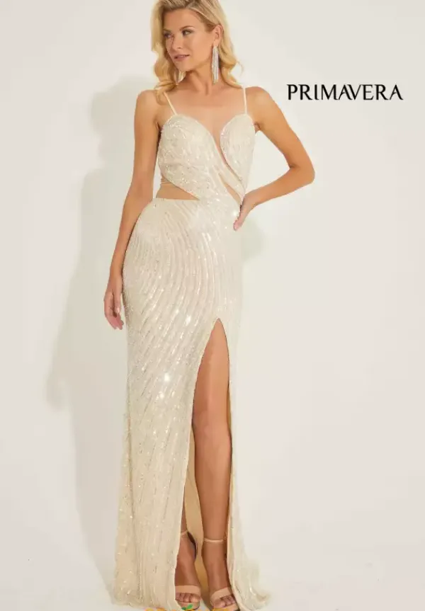 Make a statement in this all over sparkling beaded dress from Primavera style 4327. This sweetheart neckline dress showcases thin adjustable shoulder straps. The dress then has a side illusion cut out that matches the key hole slot openings in the front. The swirl pattern of beadwork travels all the way down to the hem.