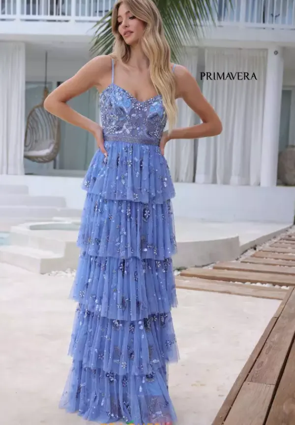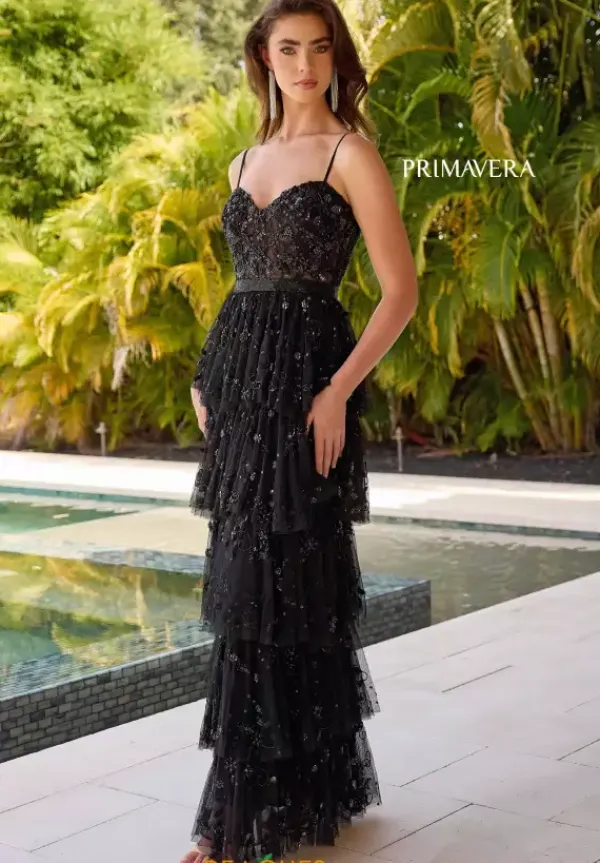 Feel like a modern day princess wearing this graceful long fitted dress by Primavera, style 4341. Featuring a sweetheart neckline and corset lace up that cinches the small of your waist. This skirt showcases lovely ruffles that flow beautifully at your every move. Entirely adorned in beadwork, you will shine the night away.