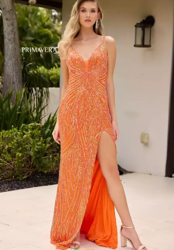 Have fun all night long when you wear this dress by Primavera style 4368. This fitted dress showcases a v neckline with a mesh panel supported with thin straps which reveal an open back. The beading and sequins reveal a vibrant burst like pattern. The high slit and the sweep train are extremely flattering.