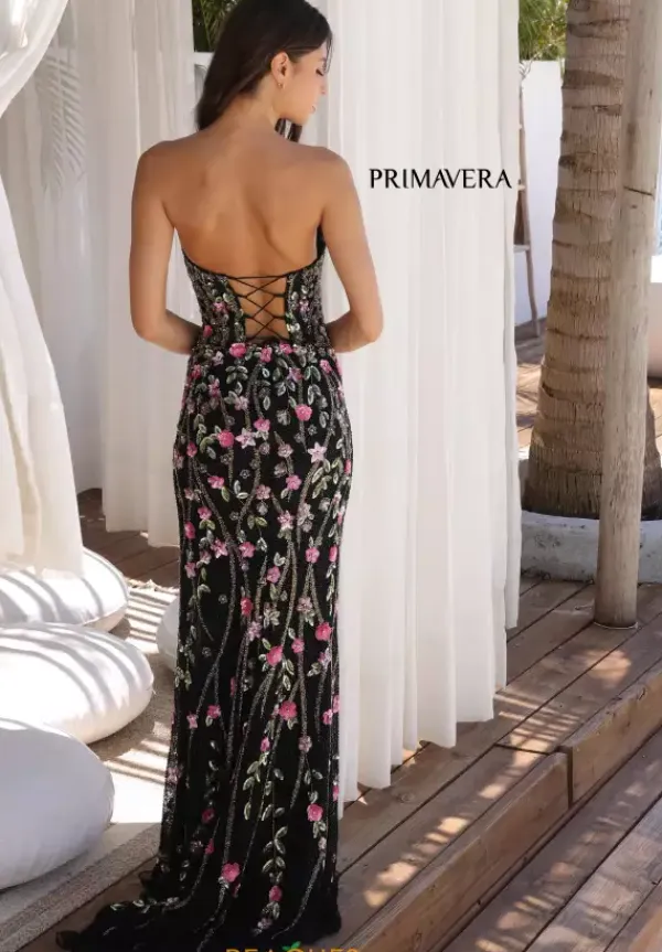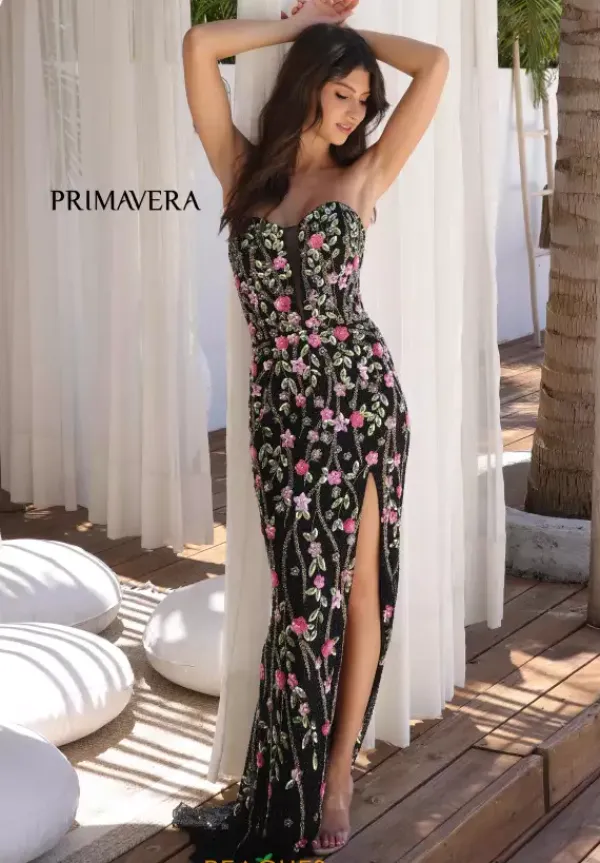 Unveil your charm when you choose to purchase this dress by Primavera style 4380. This fitted dress features a strapless scoop neckline with a mesh panel down the middle. The back displays a corset lace up to support and accentuate your figure. The thigh high slit is paired with the sweep train. The beading and sequins is formed in floral patterns, decorating the entire dress.