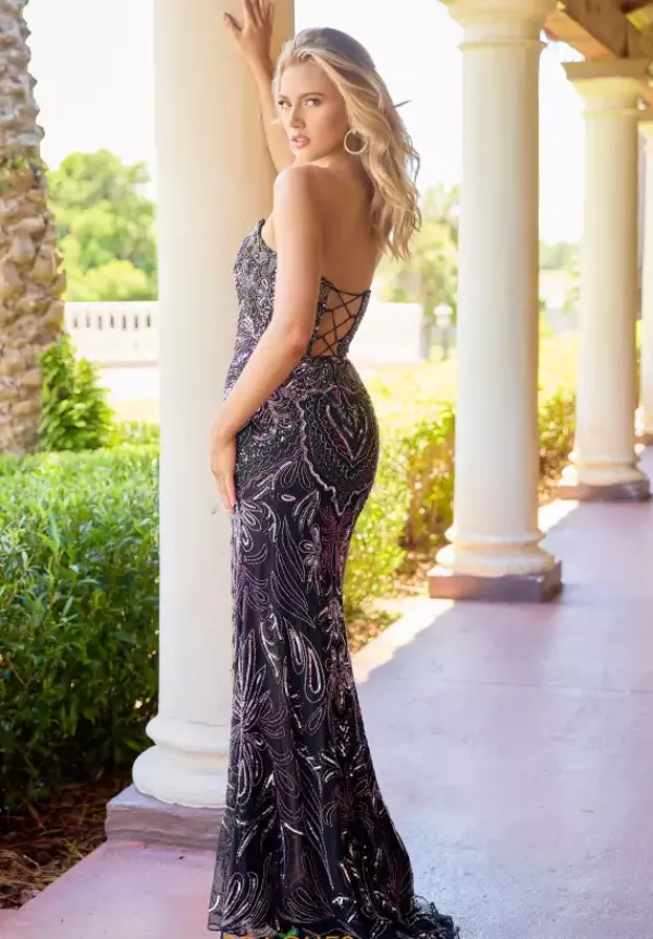 This glamorous strapless Primavera dress 4382 is the perfect choice for your next event. This dress is adorned with a unique beadwork that shimmers at every angle and a bold leg slit. A sweep train flows beautifully from the back, completing the look and giving just the right amount of elegance and glam.