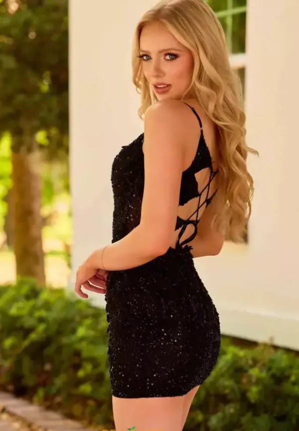 Impeccable short style 4459 by Primavera is the perfect choice for your upcoming homecoming. The illusion bodice is intricately detailed with whimsical lines of trailing sequin to match the bottom of the skirt. Delicately adorned with 3D beading which trims the v neckline and makes its way sparsely along the flattering fitted skirt.