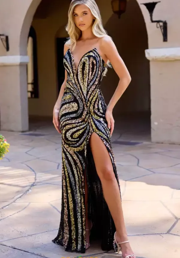 Have a major fashion moment and show up to prom in this all over beaded Primavera long dress style 4501. The deep v strapless neckline dress features an adjustable lace up in the back for a secure fit. The lovely swirl pattern of color blocked beads and sequins flow together to create an elegant pattern.