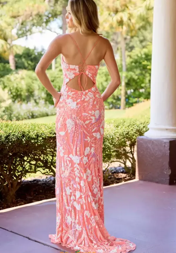 Strike a pose in this glamors long fitted dress by Primavera 4553. This one of a kind dress features a scoop neckline that cascades into a open sexy back with a corset lace up that will hug your curves beautifully. The entire dress is decorated in dazzling beadwork and sequins as well as a train and a slit.