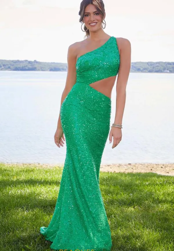 Show off your inner fashionista and wear this fantastic long dress 47029 by Morilee. This sparkling style is completely covered in shining sequins that provide an ethereal glow. An asymmetrical neckline pairs perfectly with a wide side midriff cutout to flatter your natural curves. The slimming silhouette is finished with a dramatic train.