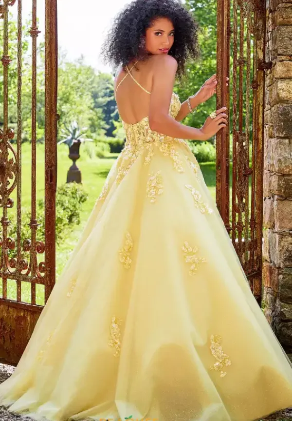 Make a grand entrance in this absolutely amazing ball gown dress 47036 by Morilee. This regal style is adorned with elegant lace appliques that flow gracefully down the gown. The corset style bodice has a v neckline with thin straps that wrap into a criss cross open back . The full skirt features a slight sweep train.
