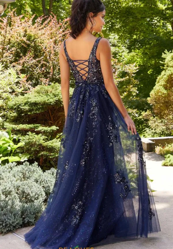 Channel your inner fashionista and wear this one of a kind long dress 47066 by Morilee. This versatile look showcases a fitted silhouette with detachable overskirt adorned with lace appliques. The scoop neckline has thick straps that wrap into a lace up open back. Additional features on this gown include a side front slit and train.