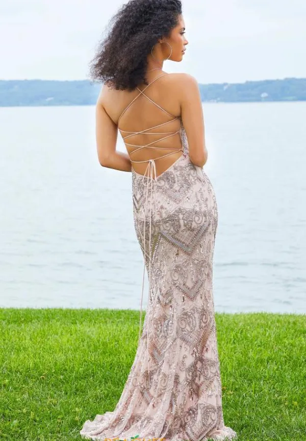 Sparkle and shimmer effortlessly in this Morilee beaded long dress 47078. The scoop style neckline dress showcases thing spaghetti straps that turn into an adjustable lace up in the back to give you a snug fit. The intricate hand sewn beadwork pops against the contrast of the dress. A front thigh high side slit and gorgeous train complete this look.