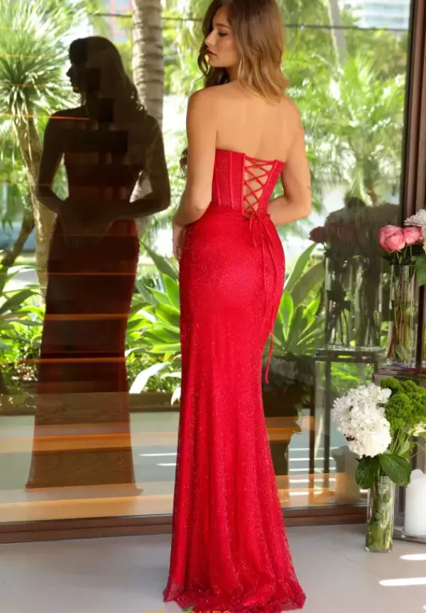 Go viral when you wear this dramatic sweep train dress style 47114 designed by Ava Presley. This fully beaded dress shimmers from every angle and displays a daring shark bite slit along with a popular and adjustable corset bodice plus strapless neckline with asymmetrical ruching for an elegant finish.