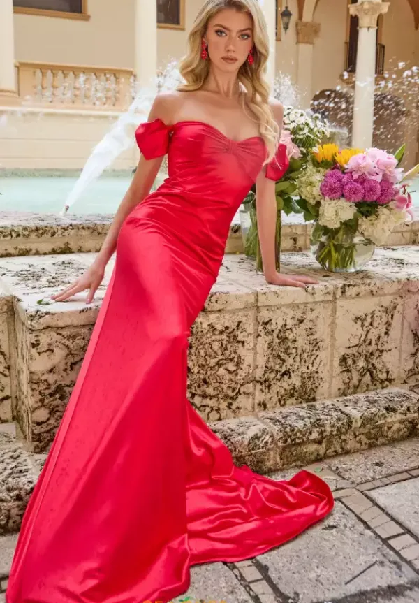 Exude elegance at your next event when wearing this long fitted dress by Ava Presley, style 47178. Showcasing a open back and sweetheart neckline with off the shoulder cap sleeves paired with a lovely bow. The long sweep train flows gracefully behind you. Made in satin material giving you that phenomenal picture perfect look.
