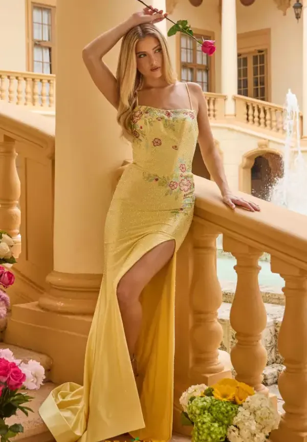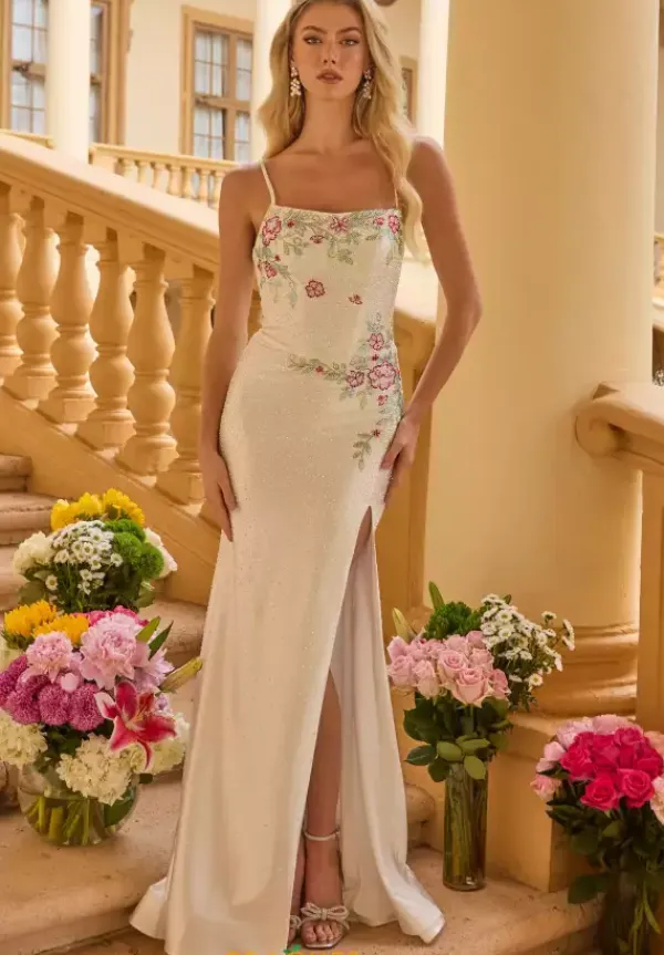Shimmer from top to bottom in this heat set rhinestone beaded Ava Presley prom dress style 47281. The scoop neckline features thin shoulder straps and an adjustable lace up in the back. The rhinestones shimmer with a floral inspired pattern in the front. The jersey material skirt has a thigh high slit and sweeping train.