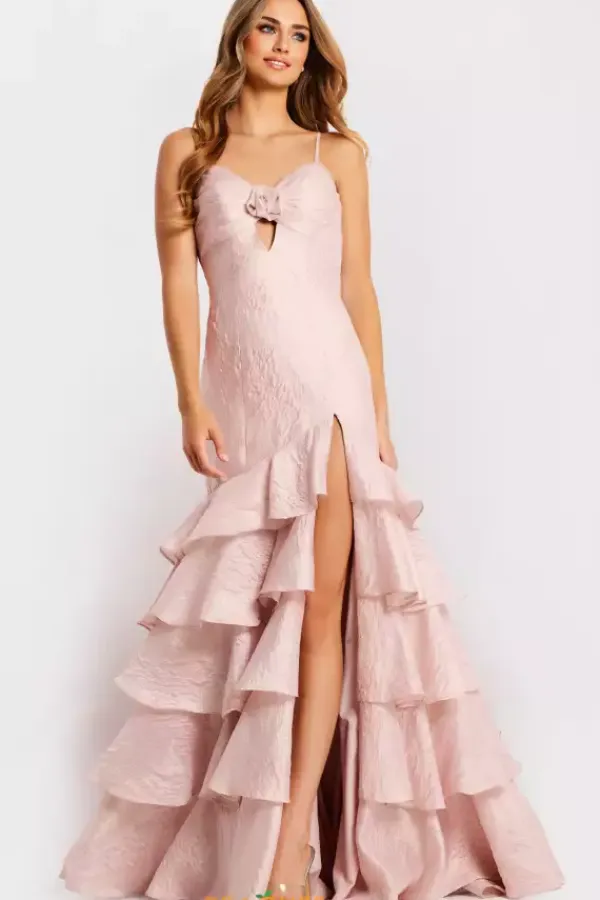 We just love this jaw dropping fitted Jovani dress style 47329. This jacquard novelty material is unique and stunning. The v neckline has a small key hole cut out with a three dimensional flower detail. The ruffled tiered layered skirt starts right above the knee with a thigh high front side slit.