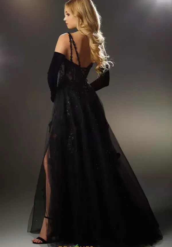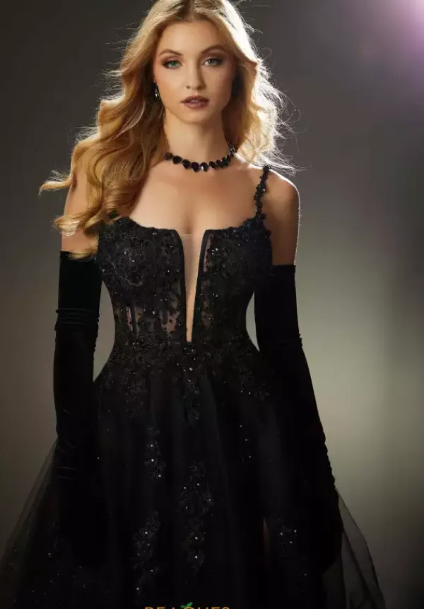 Be ready to stun all the guest wearing this Morilee 48005 gown on prom night. This ensemble features a scoop neckline and corset bodice that is decorated with floral applique which laces on the back. An a line skirt is styled with glitter tulle and reveals a high slit that is perfect for posing in front of the camera.