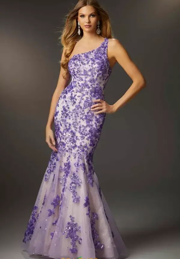 Feel fabulous in this mermaid style prom dress from Morilee style 48025. The single shoulder asymmetric neckline is embellished with sequins appliques. The trio if straps branch from the top of the strap and onto your open back. The fit and flare skirt flows from right above the knees. The sparkling sequins appliques are throughout the whole dress.