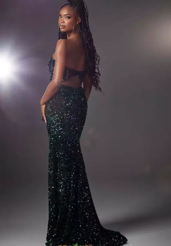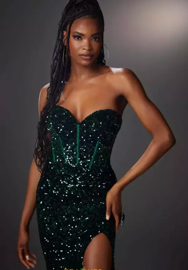 Be the it girl in this ultra chic Morilee style 48069. Sexy, yet sophisticated this gleaming gown features a strapless neckline and slim fitted silhouette. The alluring corset bodice hugs your curves highlighting your hourglass silhouette. Shimmering sequins adorns the entire ensemble for the perfect pop of sparkle. Picture perfect, the fitted skirt showcases a high appealing slit.