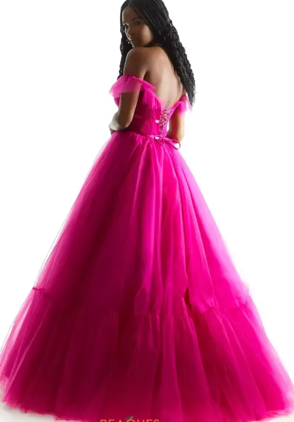 Make a statement this year at your senior prom in this absolutely gorgeous Morilee ball gown style 49022 made in vibrant shades of tulle. This stellar silhouette showcases a pleated corset bodice with a sweetheart neckline, off the shoulder cap sleeves, low back with lace up tie and sweet satin ribbon trim. The long, ball gown skirt has tulle layers, ruffle trim and a sweep train.