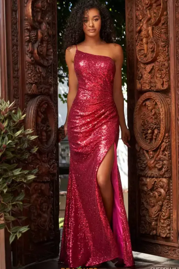 We are loving all this sparkle on this Sherri Hill long dress 54869. Available in bold stunning colors, this asymmetrical neckline has a single shoulder strap. Wrap style ruching gather to one side of the look and thigh high front side slit in on the asymmetrical angle too. Perfect choice for your next special event.